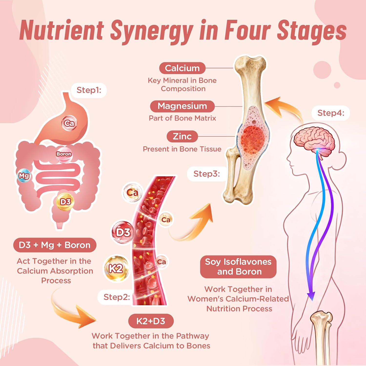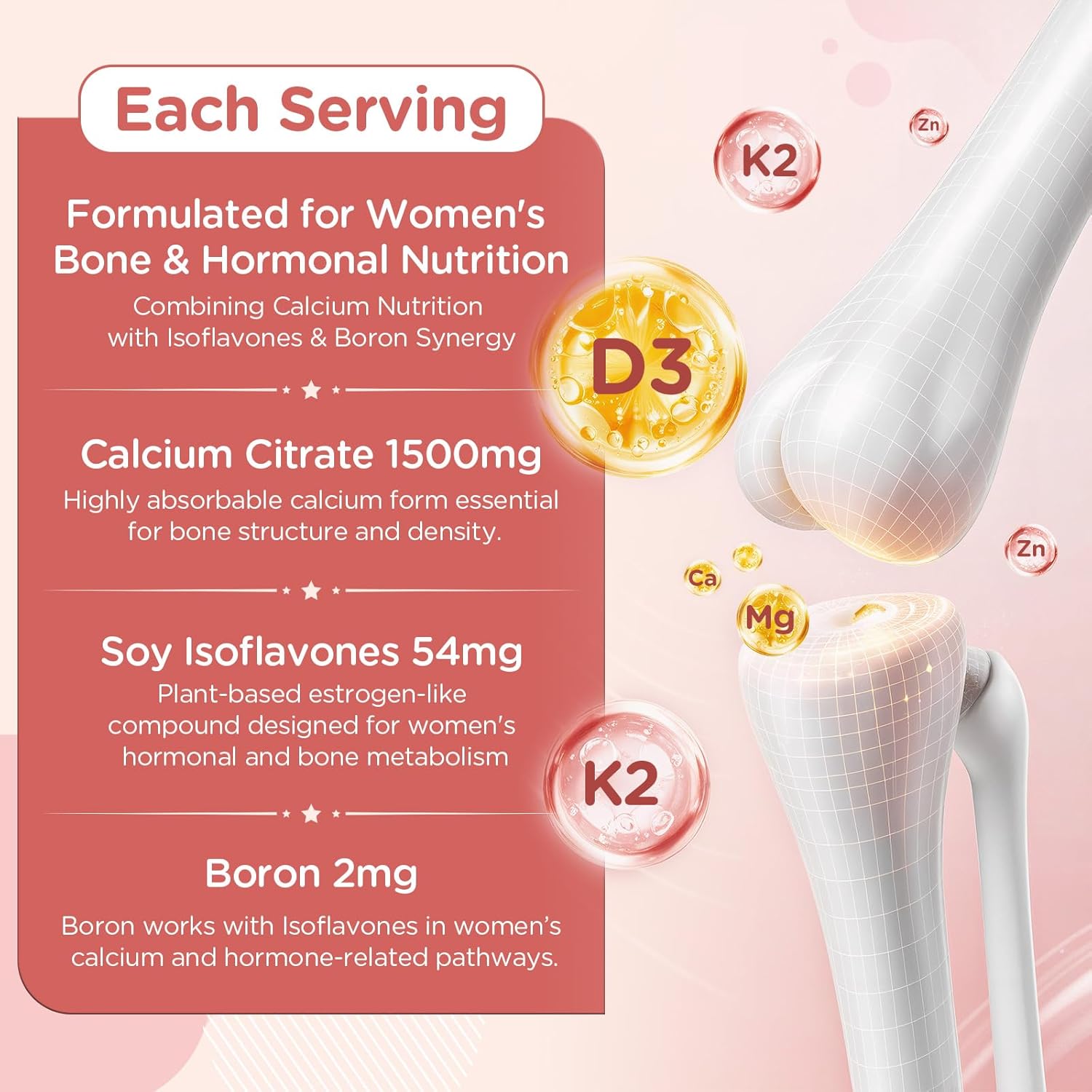 High Calcium Content – Delivers 1500mg of calcium per daily serving, combined with Vitamin D3, K2, Magnesium, Zinc, Boron and Soy Isoflavones. Formulated with calcium citrate, magnesium glycinate, and chelated zinc, in forms that are gentle on digestion and easy to consume every day.