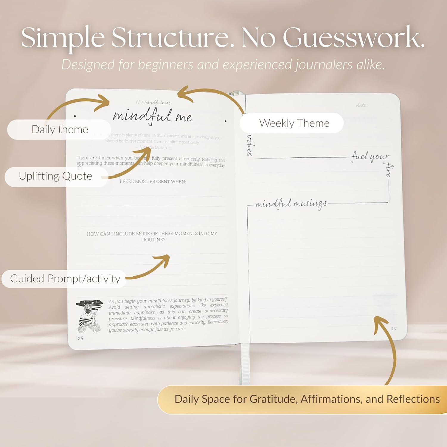 Weekly themes deepen awareness. Mindful exercises turn insight into gentle action.