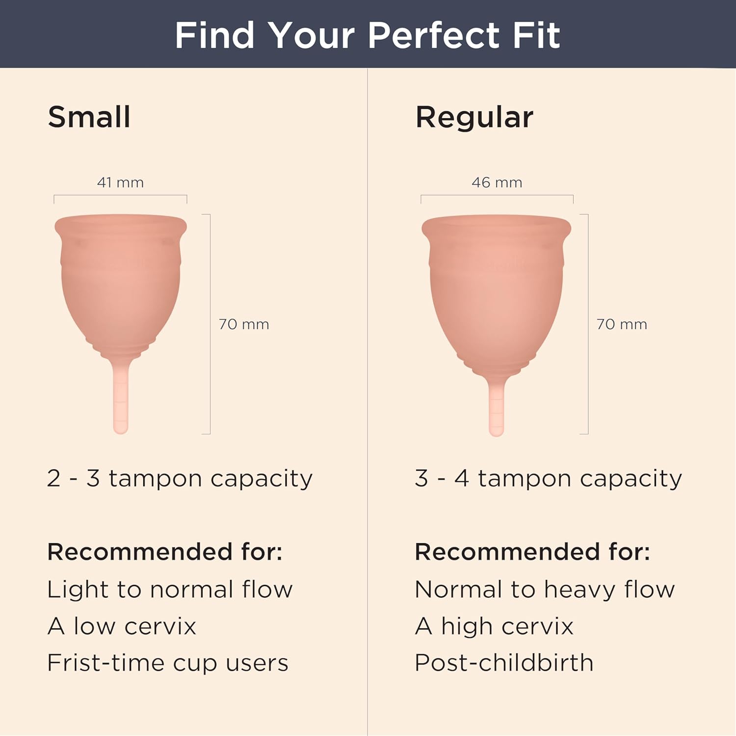 FLEXIBLE FIT FOR LEAK-FREE COMFORT: The soft period cup moves with your body for up to 12 hours of protection, even overnight. Small = light to normal flow (2–3 tampons), Regular = medium to heavy flow (3–4 tampons).
